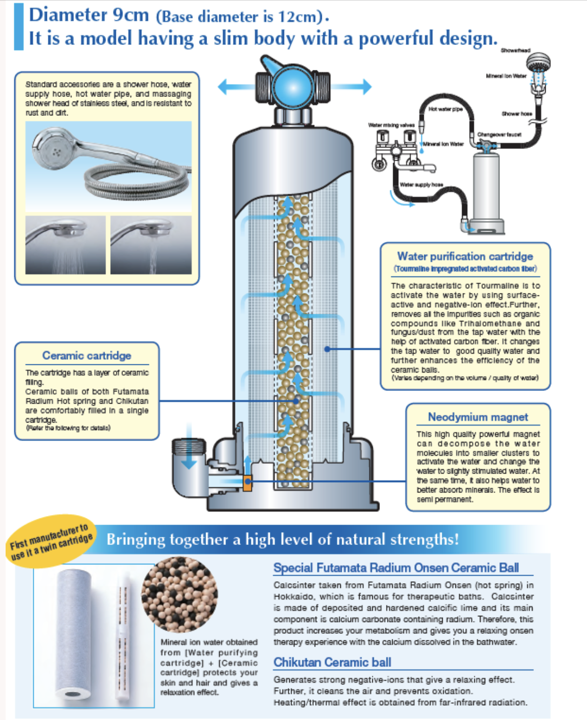 After filtration, the water flows through a secondary mineral cartridge containing natural materials such as Tufa Stone, MIC (Mineral Ion Ceramic) media, and Power Stone. Tufa Stone is a porous, calcium-rich mineral (largely composed of calcium carbonate) that contributes trace mineral content and helps condition the water. MIC ceramic media are specially processed mineral ceramics designed to interact with water through surface contact, supporting mineral ion exchange and conditioning. Power Stone, another mineral-based ceramic component, is formulated to further influence the water’s mineral profile and create a mildly alkaline, mineral-enriched shower water similar in composition to certain Japanese hot spring (onsen) waters. While the Anespa is not classified as a medical device and does not claim to treat disease, its design is built around two recognized principles — reducing potential skin irritants and conditioning water with natural minerals — to provide a gentler, spa-like shower experience that many users report feels softer and more comfortable on skin and hair.